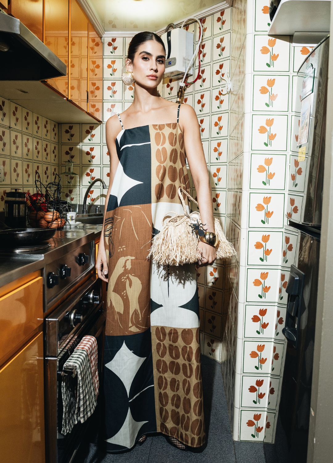 Este vestido largo, de silueta suelta y tirantes delgados, captura la esencia de una cocina colombiana y el ritual diario del café. Su estampado gráfico une ilustraciones de granos, siluetas femeninas y patrones orgánicos en una paleta de tonos tierra, negro y crema, creando un homenaje visual al universo cafetero desde una perspectiva contemporánea.