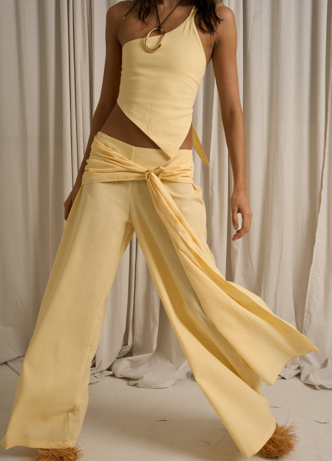 Confeccionado en lino ligero y sofisticado, este set irradia frescura y elegancia atemporal. La blusa asimétrica destaca por su silueta envolvente, que aporta movimiento y un aire contemporáneo, ideal para quienes buscan un equilibrio entre lo clásico y lo moderno. Se complementa con un pantalón de corte relajado, de pretina ancha y detalle de hebilla que acentúa la cintura con sutileza. Juntos forman un conjunto versátil y refinado, perfecto para ocasiones especiales de día o eventos al aire libre con un toque natural y estilizado.