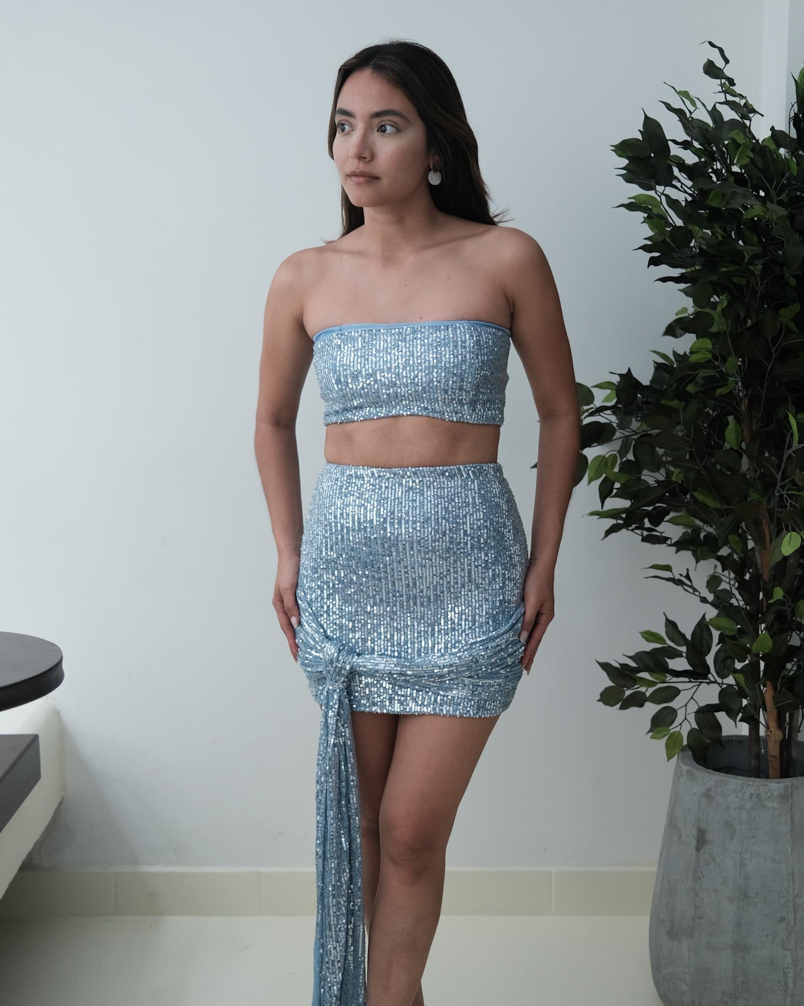Presentamos el set Esmeralda: este set de dos piezas compuesto por un top strapless con encauchado para mayor comida y  su falda corta la cual también cuenta con elástico en la cintura es ideal para las fiestas, la falda cuenta con un lazo el cual no es ajustable, viene fijo a la falda. La horma del set es perfecto para resaltar tu figura.
