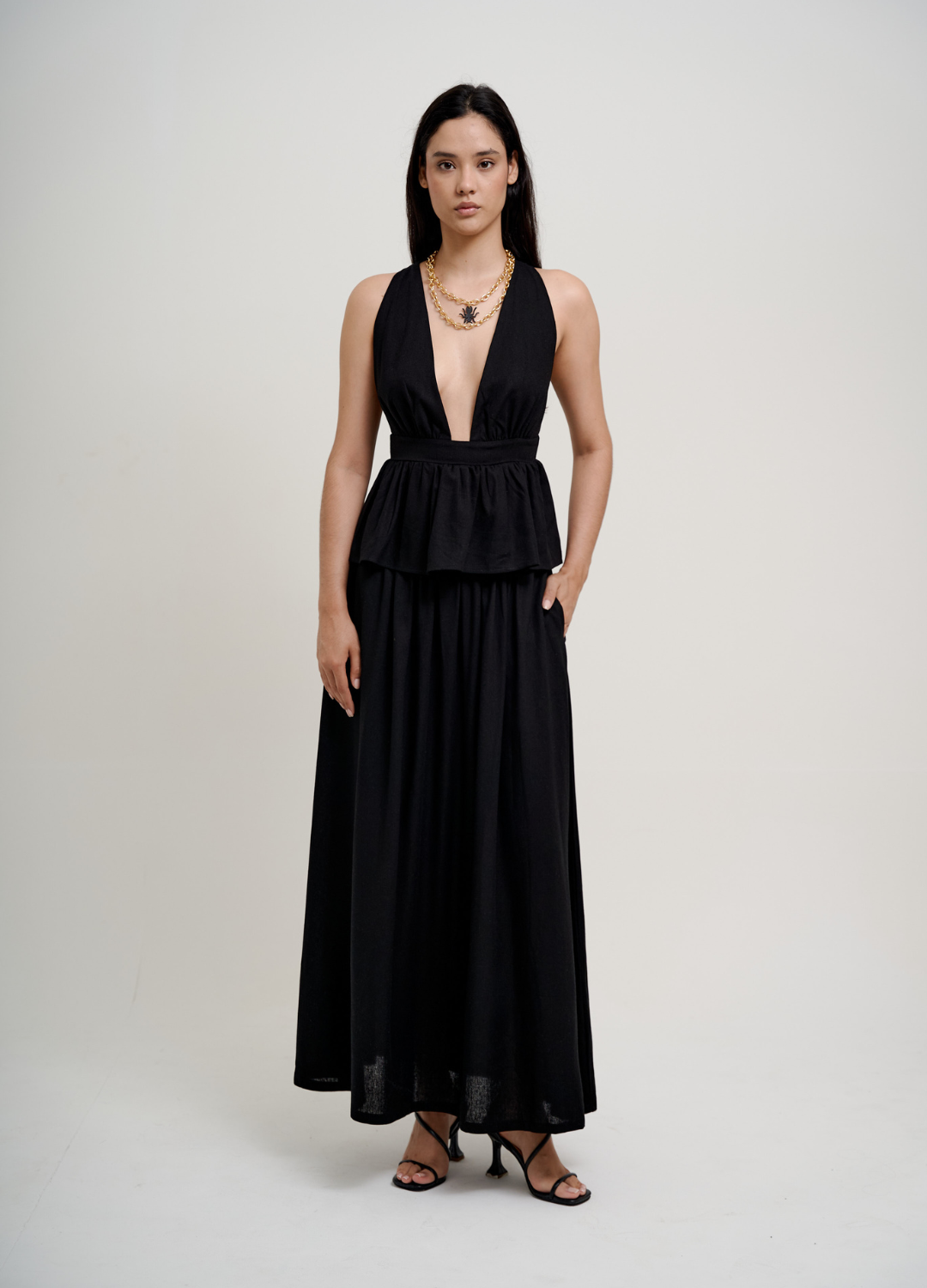 Nuestro set Polka cuenta de dos piezas una maxi falda con pliegues y una blusa de escote profundo, elaborado en lino.