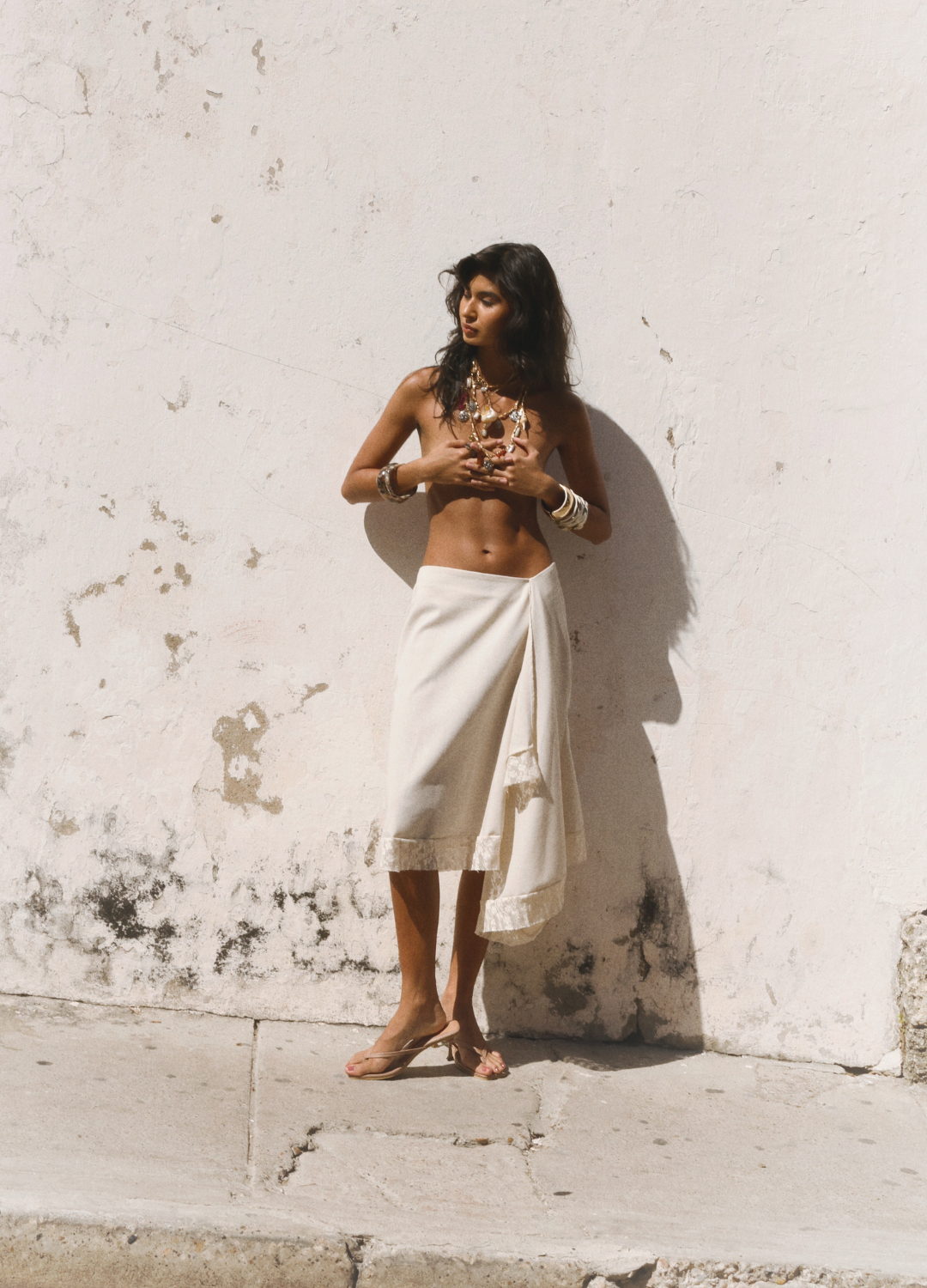 Esta falda, confeccionada en lino de alta calidad, exuda una elegancia sutil y sofisticada. Su diseño destaca por un delicado detalle de caída de tela al frente, que crea un efecto fluido y dinámico, aportando movimiento y ligereza a la prenda. En el borde final, una fina blonda de encaje añade un toque de romanticismo y distinción, elevando su estética. Con un corte que llega a media pierna, esta falda ofrece una silueta estilizada y refinada, y se ajusta perfectamente gracias a su cierre en la parte posterior, completando el look con un aire de modernidad y elegancia atemporal.