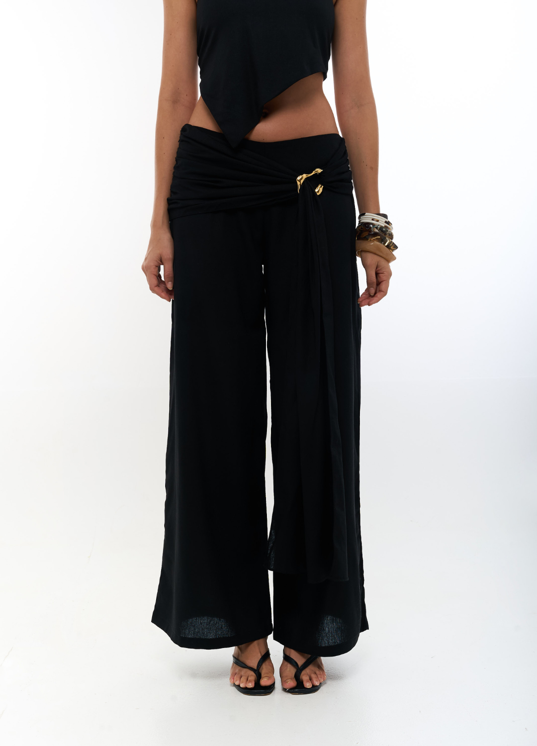 Confeccionado en lino ligero y sofisticado, este set irradia frescura y elegancia atemporal. La blusa asimétrica destaca por su silueta envolvente, que aporta movimiento y un aire contemporáneo, ideal para quienes buscan un equilibrio entre lo clásico y lo moderno. Se complementa con un pantalón de corte relajado, de pretina ancha y detalle de hebilla que acentúa la cintura con sutileza. Juntos forman un conjunto versátil y refinado, perfecto para ocasiones especiales de día o eventos al aire libre con un toque natural y estilizado.