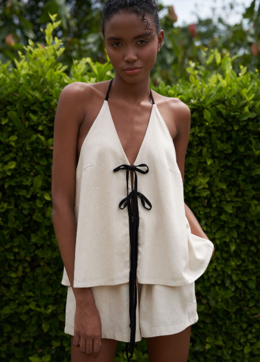 Blusa elaborada en lino, escote en la parte de la espalda, tiene para ajustar al gusto en la parte superior (cuello) en la parte de al frente dos moños y en la parte de atrás. El short también elaborado en lino cuenta con pretina encaucha y con cordón para ajustar, bolsillos laterales.