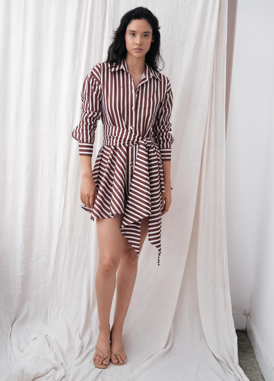 El vestido Trevi es una prenda versátil y sofisticada que combina comodidad y estilo, elaborada en lino . Su diseño camisero con silueta fluida se realza con un fajón ajustable, permitiendo ceñir la cintura y resaltar la figura de manera elegante. El estampado exclusivo de la marca, en franjas verticales que estilizan y alargan, le da un aire moderno y atemporal.